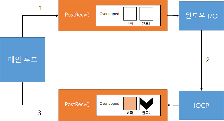 2. Window I/O에서 Overlapped의 비동기 입출력 결과(위 그림에서는 완료?)와 버퍼가 채워짐.