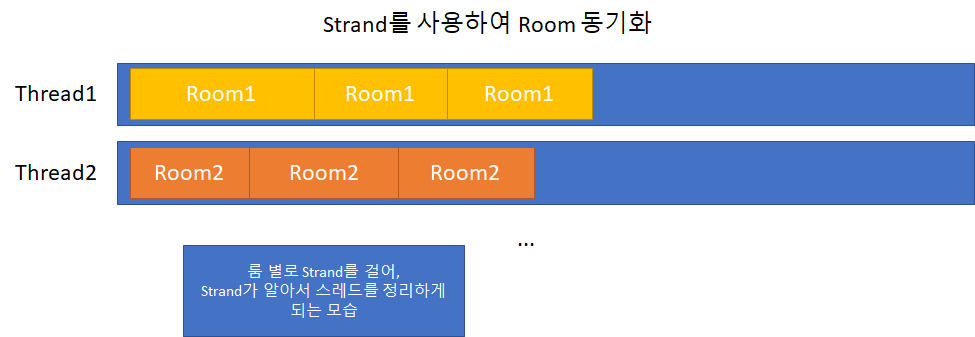 Strand를 사용하면 같은 핸들러(Room)가 겹치지 않게 Strand가 알아서 함수를 실행시켜 준다. 심지어 Strand 별로 호출 순서도 보장해준다.